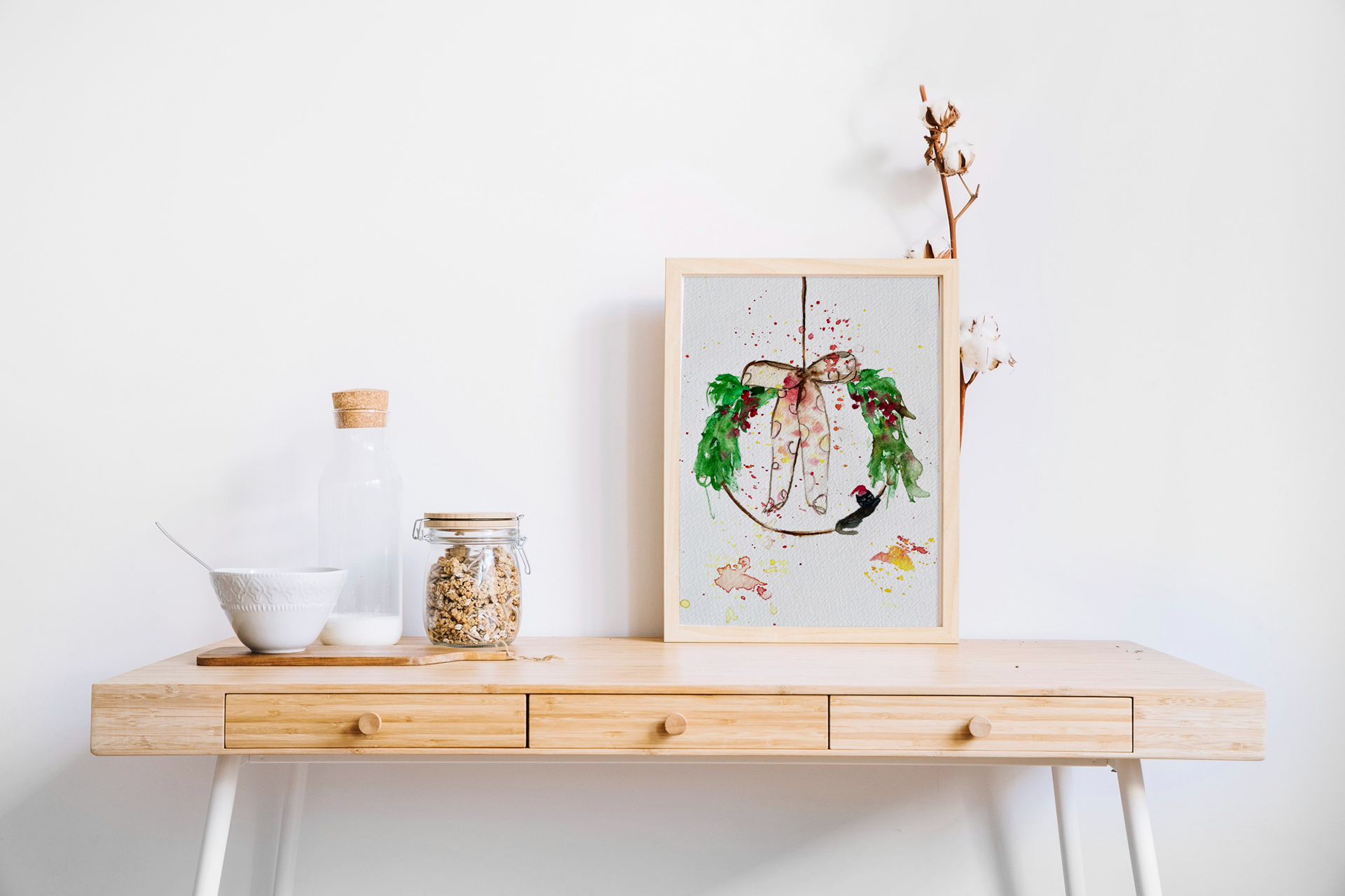 "A Cat on Christmas wreath", 5"x7", watercolour on watercolour paper